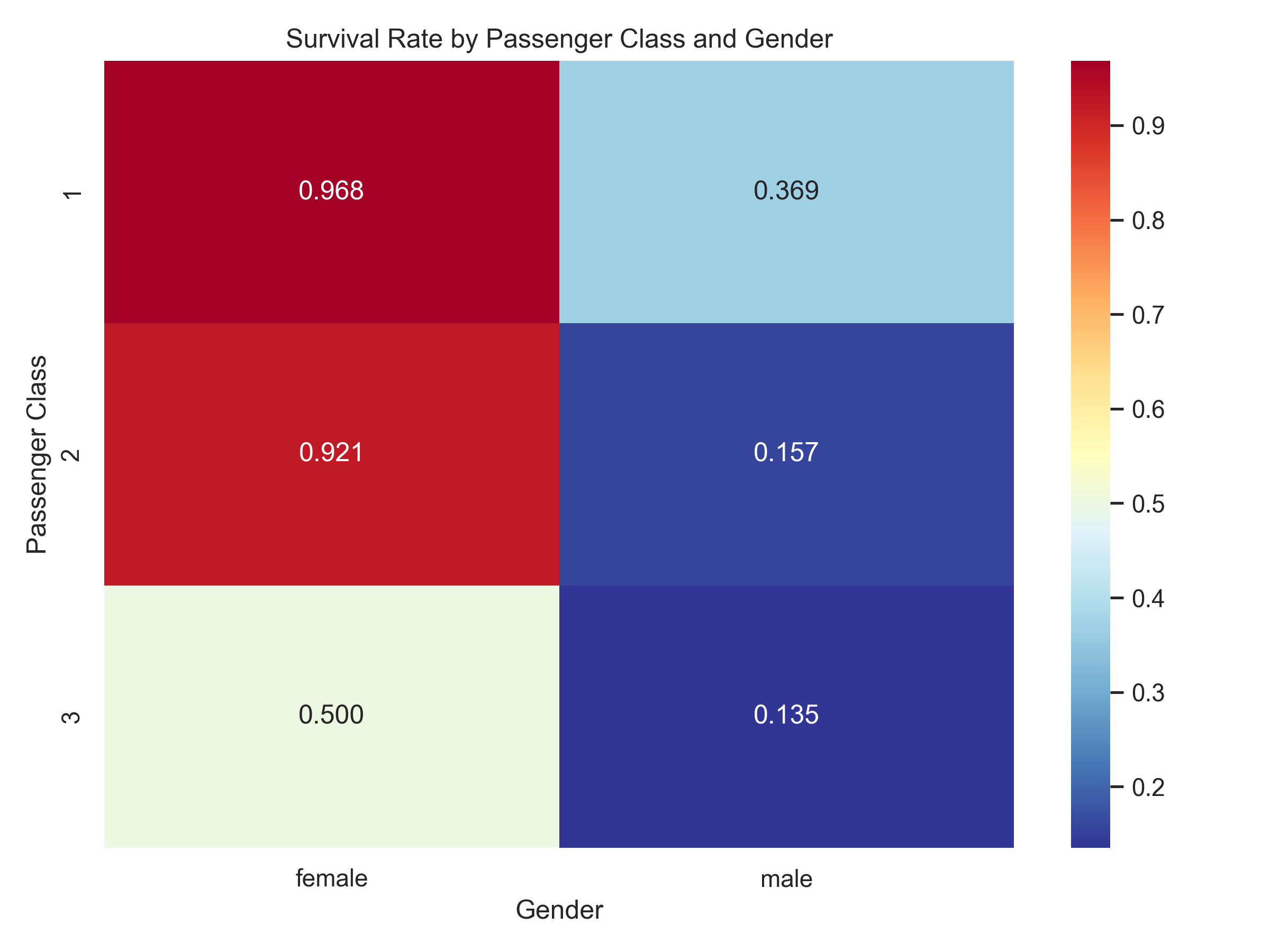 Passenger Class clearly stratified outcomes — higher class meant better chances. The extremes: 1st-class females (~0.97 survival) vs 3rd-class males (~0.14).