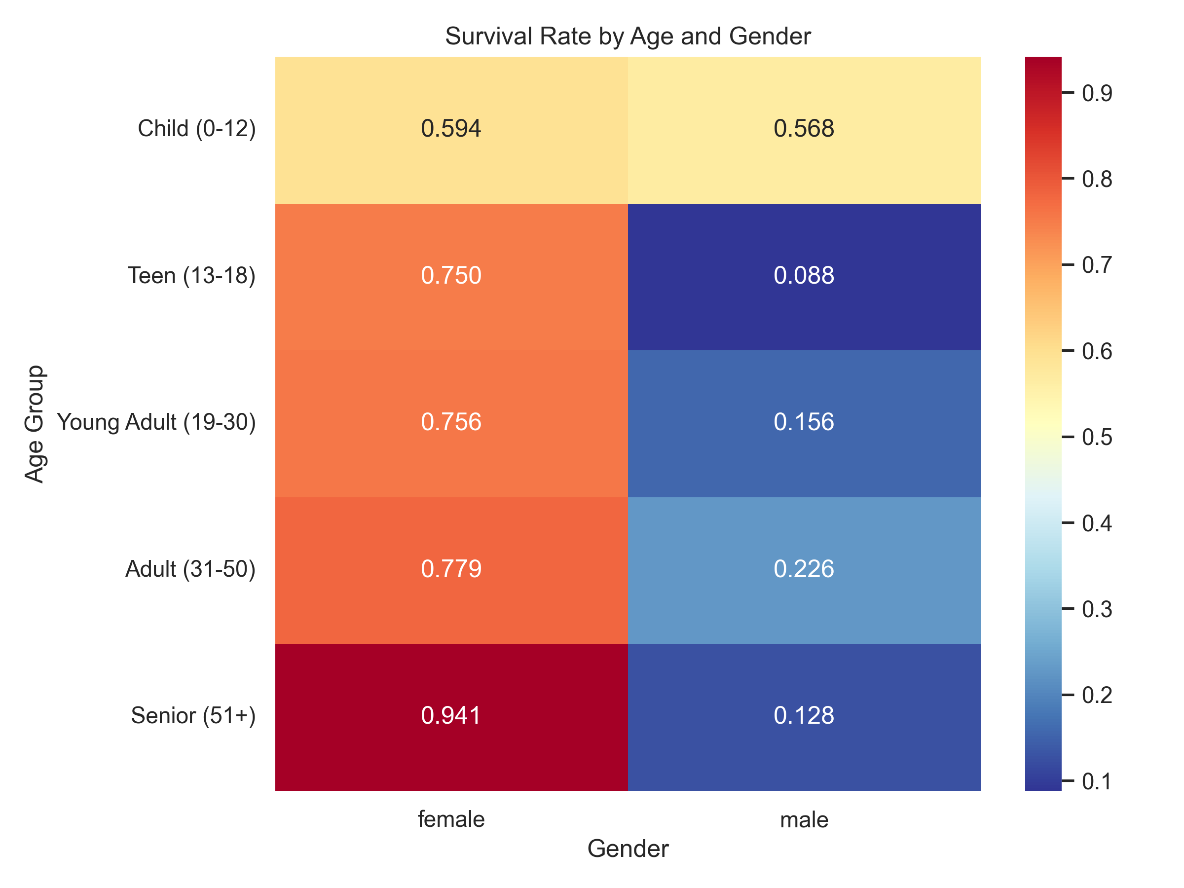 Age mattered: children were prioritized during evacuation. Boys and girls under 12 had similar survival rates (~0.57–0.59), but after adolescence, the gender gap widened sharply.